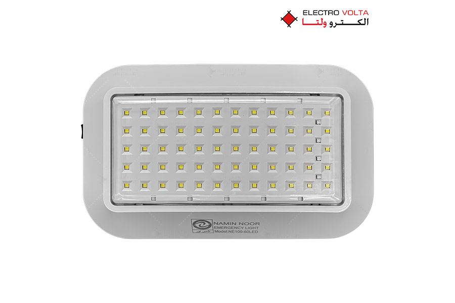 چراغ اضطراری هوشمند نامین نور مدل NE100 یک چراغ LED شارژی با 60 عدد لامپ SMD است که در زمان قطع برق به‌طور خودکار روشن می‌شود. دارای بدنه ABS مقاوم، نور مهتابی، باتری لیتیوم با بازدهی 4 تا 5 ساعت و قابلیت تنظیم شدت نور.